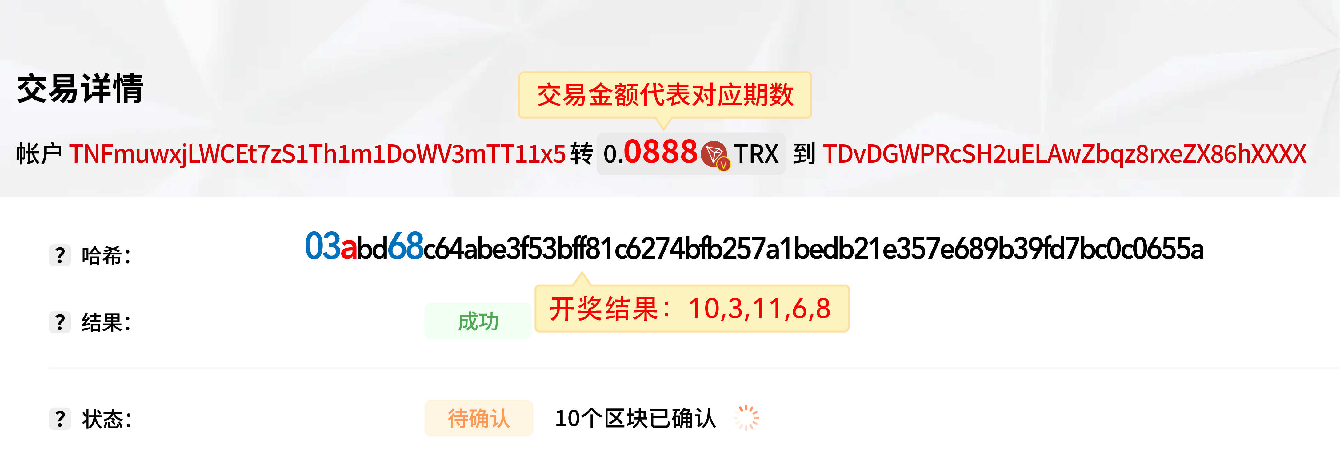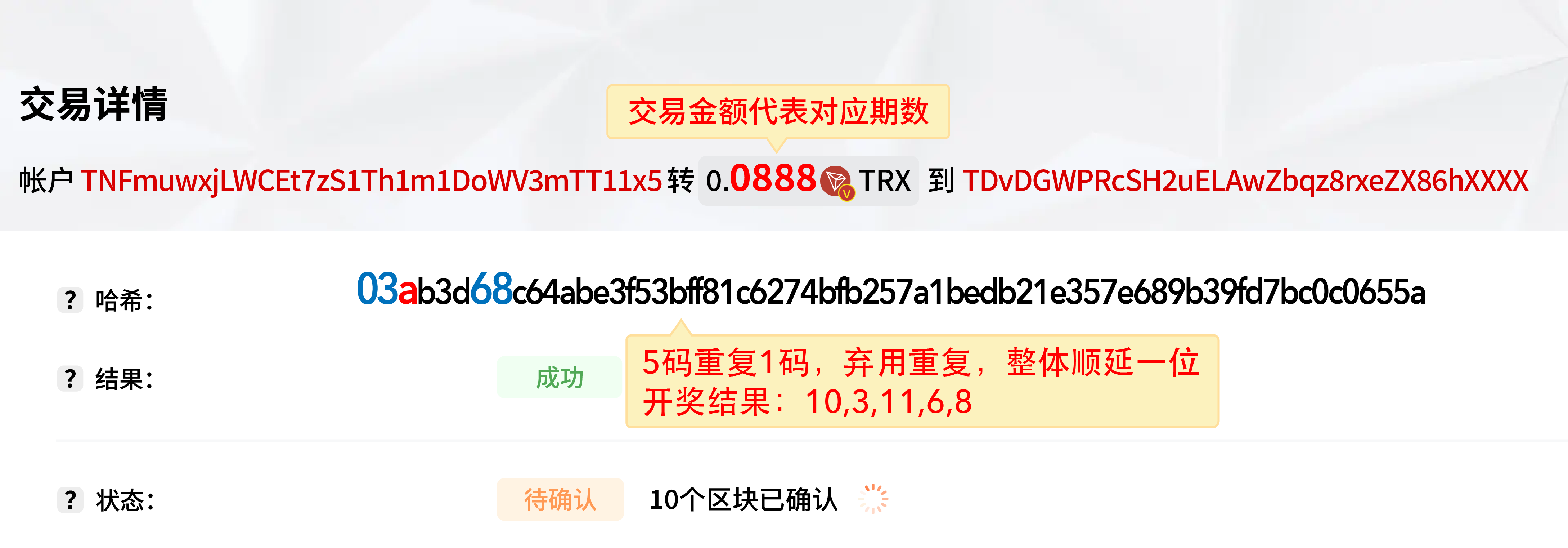 2. 每期封盘后系统开始转账,仅转一笔,转账金额尾数即为当期期号(例:888期转0.0888)